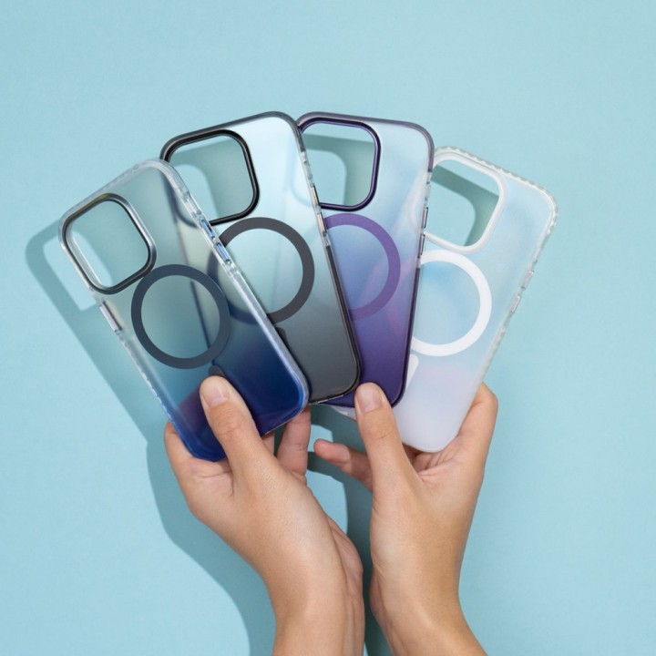 Чохол має цікаве градієнтне забарвлення, яке плавно перетікає від прозорого до більш насиченого. Матове покриття гарно поєднується з обрисами магніту, який не закриває логотип вашого гаджета.