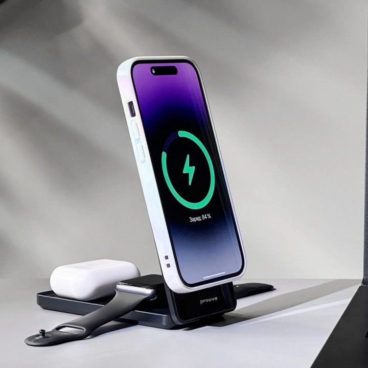 Proove Metal Edge допоможе зарядити одразу три різні пристрої без втрати потужності. Гаджет має 3 різні точки контакту: для годинника, навушників та смартфону, що компактно розміщенні та не заважають один одному.
