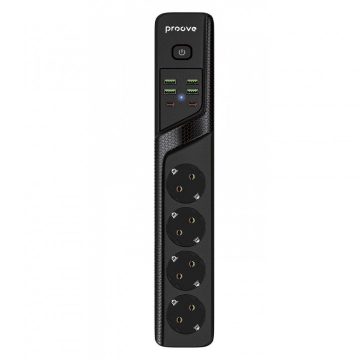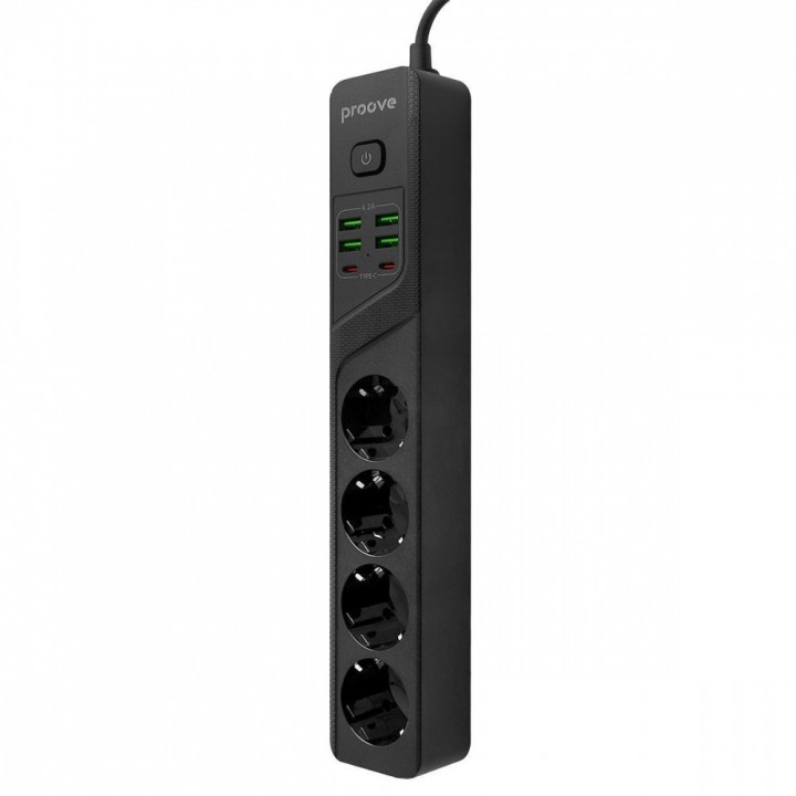 Proove Power Socket P-04 обладнаний 4xAC та підтримує потужність 2500W, що дозволяє живити навіть холодильник. Також мережевий фільтр має 4xUSB та 2xType-C з максимальною силою струму до 5V/2.4A, які доволі швидко заряджають потрібний гаджет.